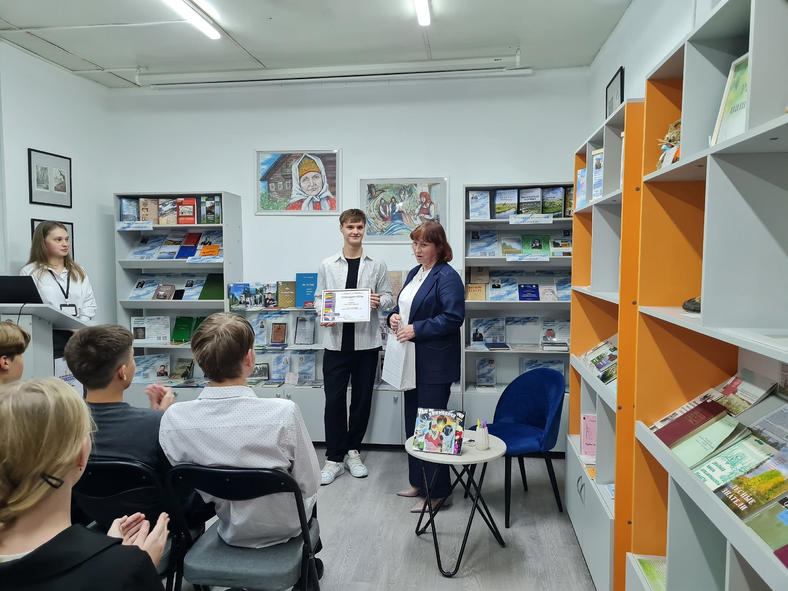 В Центральной районной библиотеке в рамках районного фестиваля «Книжный ОКТЯБРЬский» прошла встреча с начинающим устьянским автором Ильёй Шаниным. Трилогия «Изюмовичи» — это приключенческая фантастика об Изюме, правителе вымышленного королевства. Книги Ильи дополнены яркими иллюстрациями, которые автор создал самостоятельно. Встреча прошла очень интересно: к молодому автору было много вопросов от читателей, а за книгами уже выстроилась очередь.
