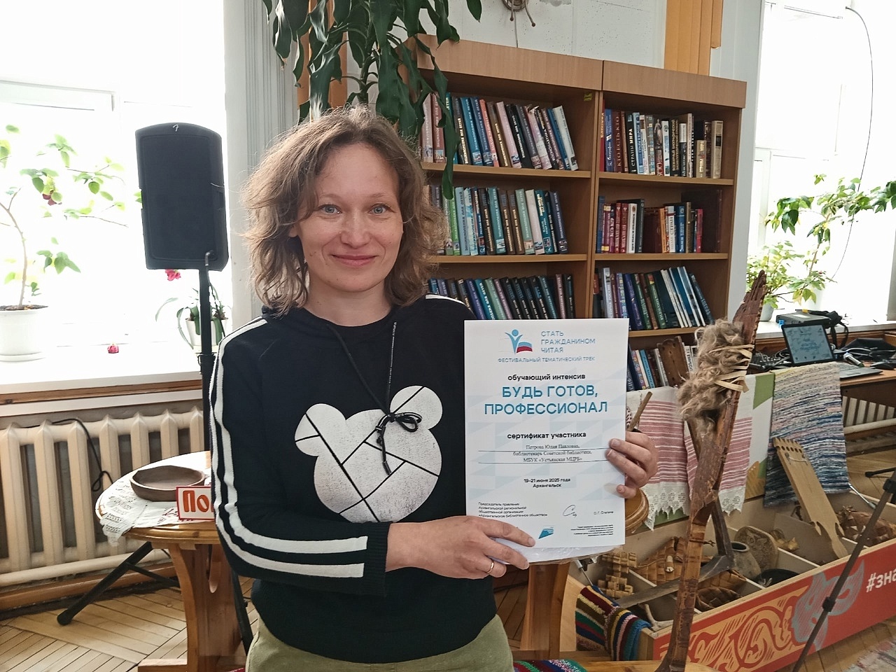 С 19 по 21 июня библиотекарь Советской библиотеки МБУК «Устьянская МЦРБ» Юлия Павловна Петрова приняла участие в интенсиве «Будь готов, профессионал». Обучение проходило в рамках проекта Архангельского библиотечного общества и Архангельской областной научной библиотеки имени Н. А. Добролюбова «Стать гражданином читая. Фестивальный тематический трек», который стал победителем конкурса грантов «Российского фонда культуры» в номинации «Библиотечное дело».